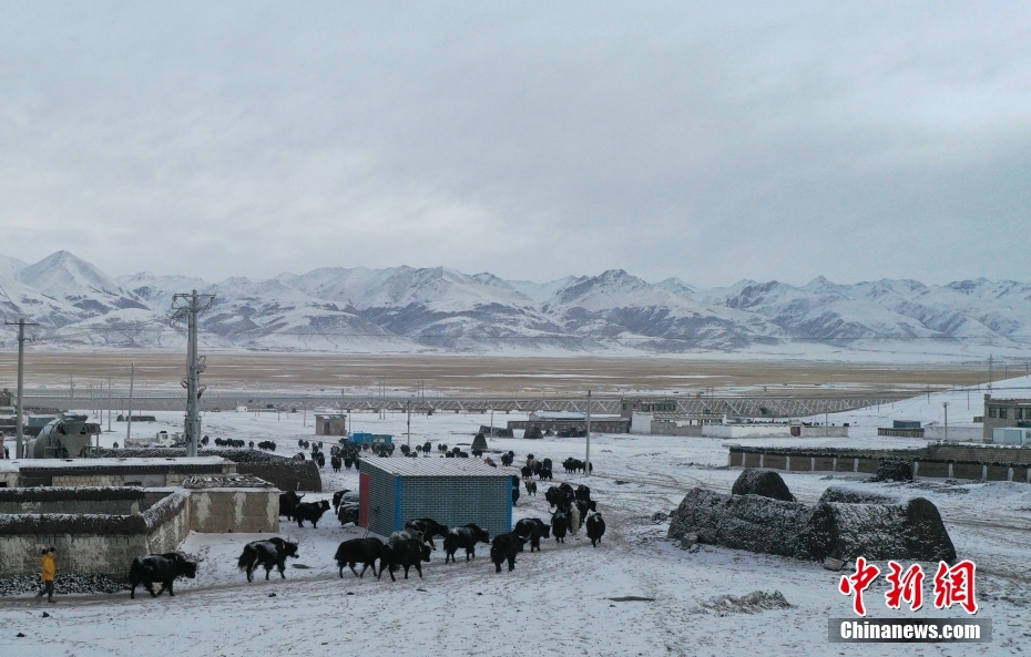 1月27日,當(dāng)雄縣龍仁鄉(xiāng)烏達(dá)村牧民在雪中放牧。當(dāng)雄縣位于西藏自治區(qū)拉薩市北部,距拉薩市區(qū)170公里。“當(dāng)雄”,藏語意為“天選牧場(chǎng)”,平均海拔約4200米,草場(chǎng)廣闊,土地肥沃。(無人機(jī)照片) 中新社記者 貢嘎來松 攝