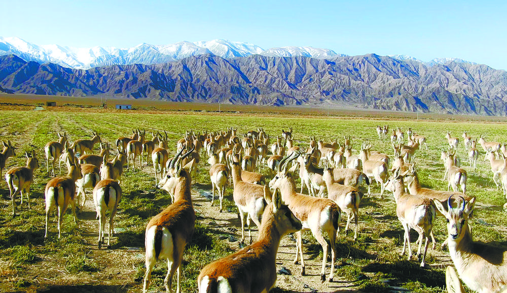 近日,200余只鵝喉羚集聚在海西蒙古族藏族自治州烏蘭縣呼德格勞牧場(chǎng)苜蓿草種植基地內(nèi),或悠閑吃草,或漫步在廣闊的牧野中,與背后的雪山構(gòu)成一幅人與自然和諧共處的美麗畫卷。