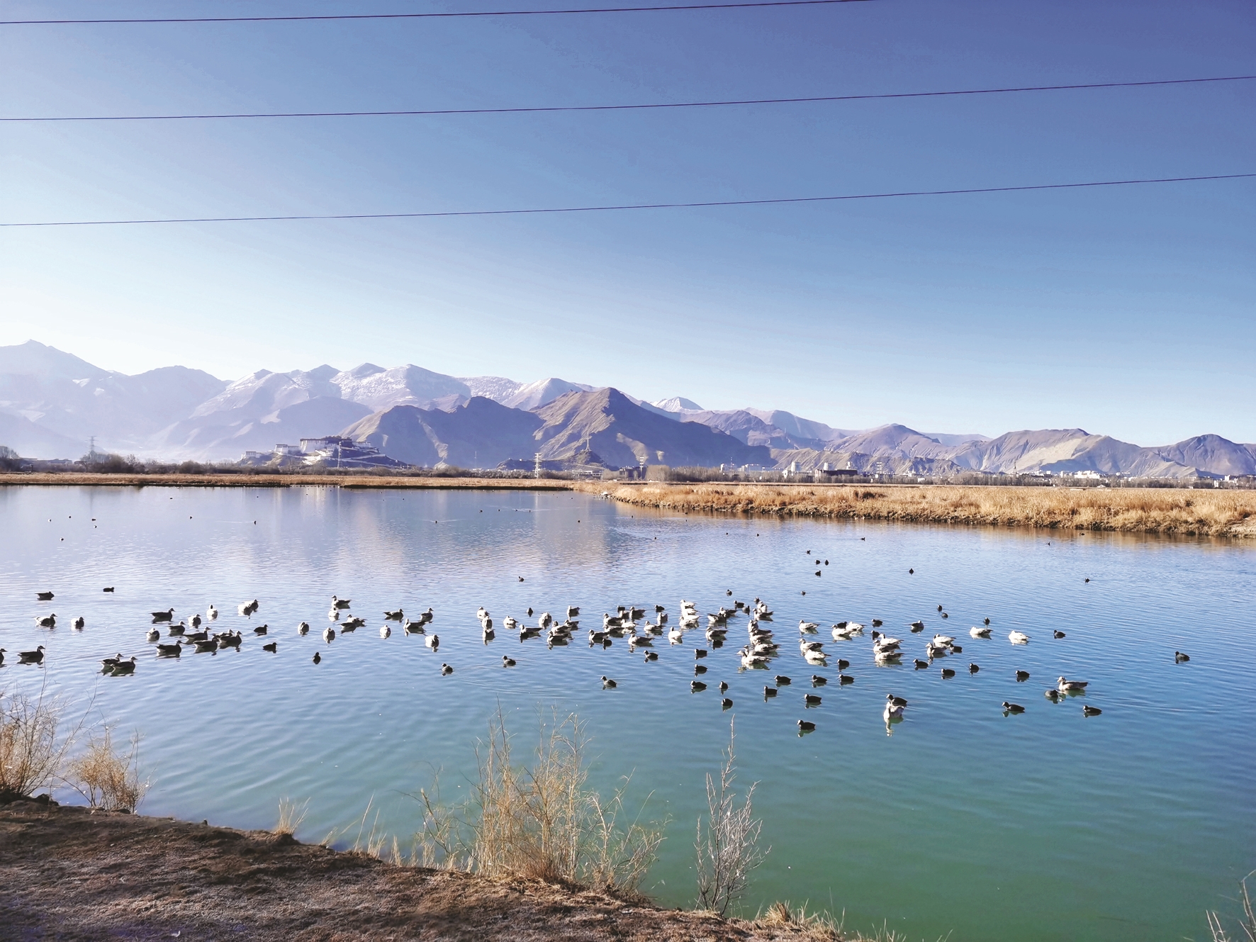 拉魯濕地內(nèi)動(dòng)物資源豐富,每年冬季11月份至次年4月份都會(huì)有大批候鳥來(lái)濕地越冬。圖為濕地成群的候鳥。 拉薩融媒記者 郝奕凝攝