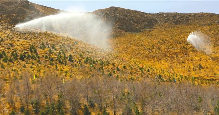 圖為拉薩南北山綠化工程的自動(dòng)智能澆水系統(tǒng)在給寶瓶山樹林澆水。 記者 格桑倫珠 實(shí)習(xí)生 達(dá)娃宗巴 攝