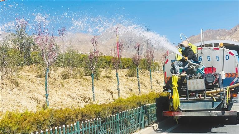相關(guān)工作人員在為路邊樹木澆水。 記者 格桑倫珠 實習生 達娃宗巴 攝