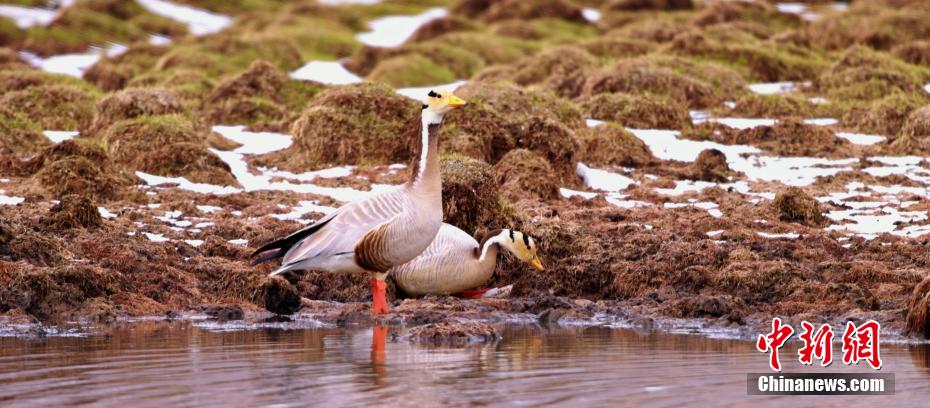 立夏以來,在位于祁連山國家公園內(nèi)的青海省海北藏族自治州祁連縣,當?shù)孛癖娕臄z到多種野生動物活動影像。圖為斑頭雁在冰面行走。