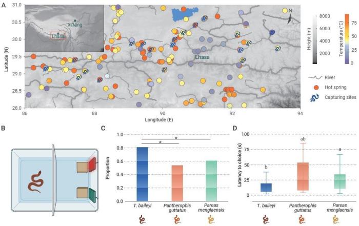 中國科研人員結(jié)合野外調(diào)查和文獻調(diào)研,整理了高原地?zé)豳Y源以及溫泉蛇的分布信息,發(fā)現(xiàn)溫泉蛇高度偏好溫泉生境。通過趨熱行為學(xué)實驗證明,相較于另外兩種低海拔蛇類,溫泉蛇能夠更快速地定位到高溫區(qū)域,且對高溫區(qū)表現(xiàn)出強烈的偏好,提示溫泉蛇具有高效的溫度感知能力。