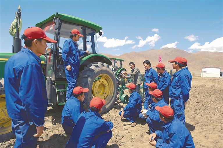 發(fā)展教育脫貧一批。2016年以來(lái),累計(jì)落實(shí)義務(wù)教育學(xué)校基本建設(shè)資金84.4億元,實(shí)施教育基礎(chǔ)建設(shè)項(xiàng)目1433個(gè),資助建檔立卡和農(nóng)村低保大學(xué)生累計(jì)6.06萬(wàn)人次,落實(shí)資助資金3.55億元。圖為西藏自治區(qū)白朗縣邀請(qǐng)山東農(nóng)機(jī)技師對(duì)當(dāng)?shù)刎毨糸_展培訓(xùn)。