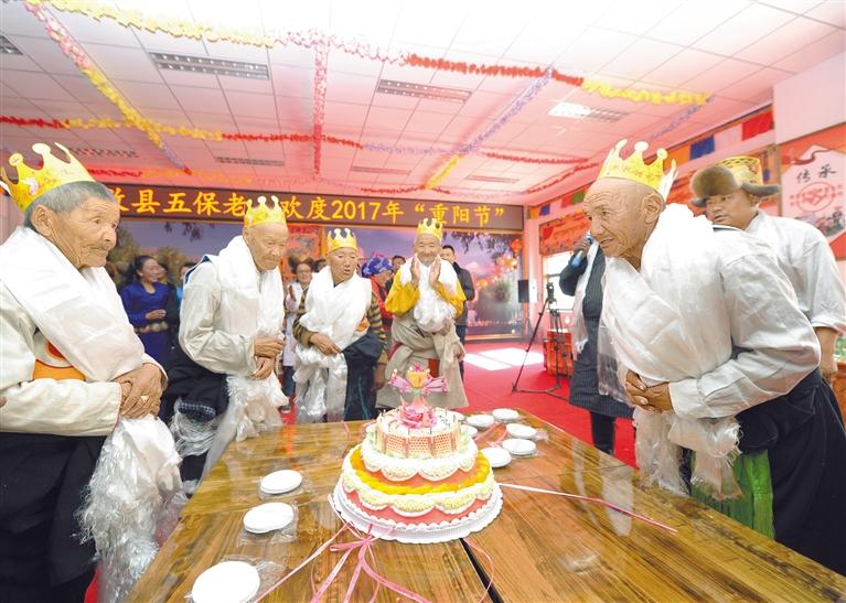 社會(huì)保障兜底一批。2021年,農(nóng)村居民最低生活保障標(biāo)準(zhǔn)達(dá)到5060元/年/人,城鎮(zhèn)居民最低生活保障標(biāo)準(zhǔn)達(dá)到10920元/年/人。圖為2017年10月28日,西藏自治區(qū)拉薩市達(dá)孜區(qū)特困人員集中供養(yǎng)服務(wù)中心為80歲老人們集體過(guò)生日。