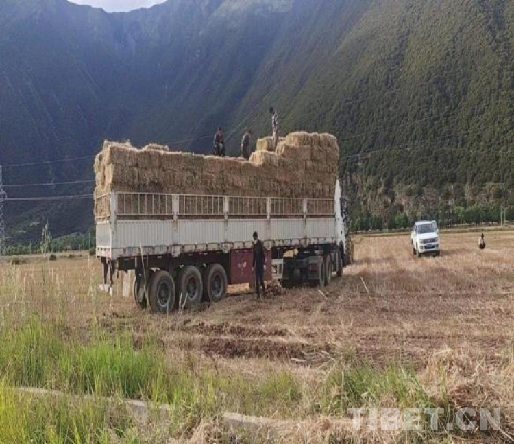 圖為國(guó)家牧草產(chǎn)業(yè)技術(shù)體系拉薩綜合試驗(yàn)站工布江達(dá)縣示范點(diǎn)秋收搶收(海拔3990米)打捆裝車的牧草