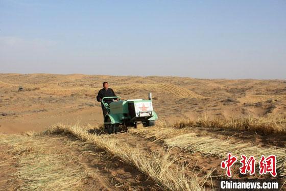 圖為甘肅省治沙研究所科研團(tuán)隊(duì)歷時(shí)6年研發(fā)的小型“手扶式沙障機(jī)”,大大減輕了草方格沙障鋪設(shè)的勞動(dòng)強(qiáng)度?!「拭C省治沙研究所供圖