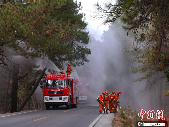 圖為森林消防員正在進(jìn)行灑水增濕作業(yè)?!“鸵藚^(qū)森林消防中隊供圖
