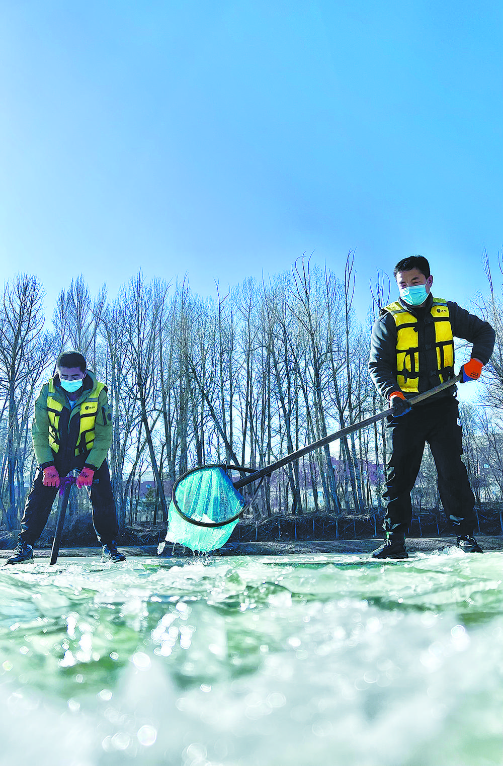陽光透過冰面照射在18口冰封的魚塘里,為過冬的小魚苗增氧增溫。這片池塘是裸鯉來到裸鯉救護(hù)中心的第一站,田文根是這里的一名工作人員,主要負(fù)責(zé)室外原種場魚苗的培育和水質(zhì)監(jiān)測(cè)工作。據(jù)他介紹,魚塘的水質(zhì)決定著魚苗的健康狀況。在冬季,及時(shí)掃雪是一項(xiàng)非常重要的工作,因?yàn)楸鶎酉旅娴穆沲庺~苗是靠浮游植物通過光合作用產(chǎn)生的氧氣生存,如果雪附著在冰層上,陽光無法透進(jìn),就容易造成缺氧。