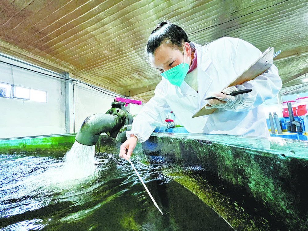 技術(shù)人員對(duì)循環(huán)水養(yǎng)殖池育苗投喂。