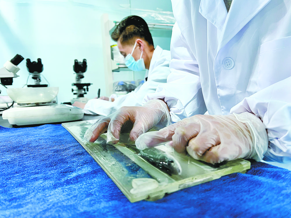 技術(shù)人員正在測(cè)量魚體的身長。