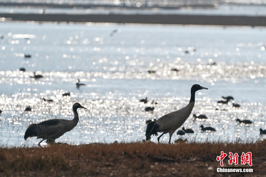 2月21日,黑頸鶴在納帕海岸邊覓食。中新社記者 劉冉陽 攝