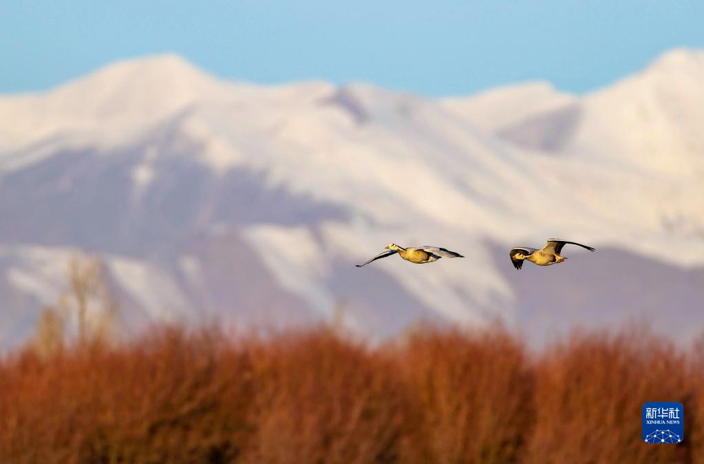 在拉薩市林周縣,斑頭雁在雪山前飛翔(3月1日攝)。新華社記者 姜帆 攝