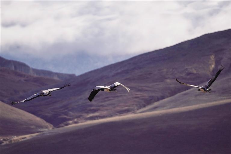 在西藏,黑頸鶴從越冬地到繁殖地有兩條線路:一條是拉薩到色林措,另一條則是從日喀則到色林措。整體來說,是從雅魯藏布江中游河谷黑頸鶴國家級(jí)自然保護(hù)區(qū)飛往色林措黑頸鶴保護(hù)區(qū),兩個(gè)保護(hù)區(qū)之間有一條固定的黑頸鶴遷徙路線,每年黑頸鶴會(huì)在3月中旬從越冬地雅江中游河谷及其支流拉薩河、年楚河流域的“一江兩河”地區(qū),飛去羌塘北部草原繁育后代;又會(huì)于11月中旬從繁殖地那曲的班戈縣、申扎縣、嘉黎縣,阿里的日土縣、普蘭縣,日喀則的昂仁縣,拉薩的當(dāng)雄縣返回到越冬地。對于雅江中游河谷來說,它是冬候鳥;對于羌塘北部草原來說,它是夏候鳥。