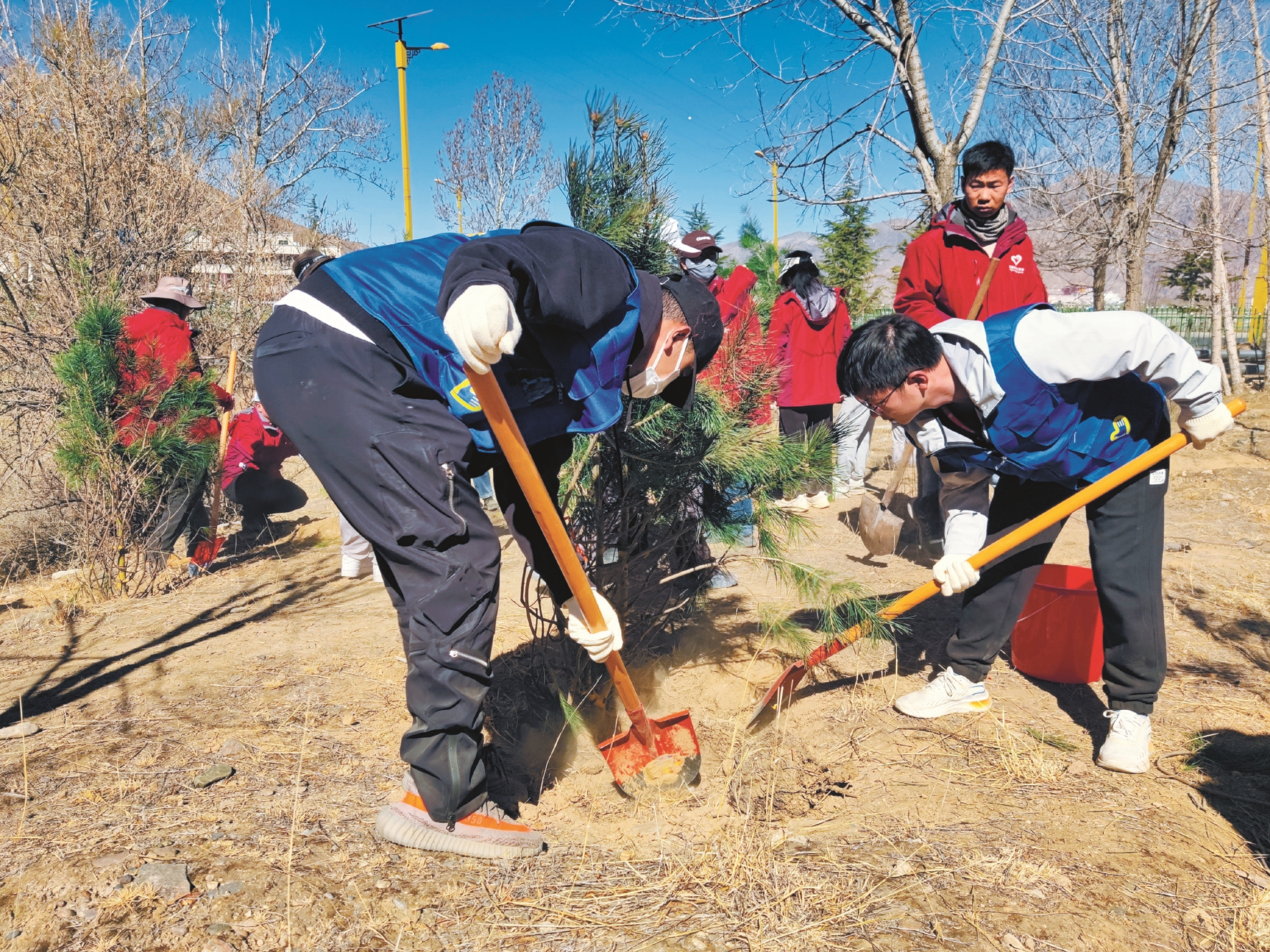 現(xiàn)場(chǎng),志愿者手拿垃圾桶、夾子等工具,認(rèn)真清理地面上的垃圾。隨后,不同團(tuán)體志愿者被劃分為7個(gè)組開始植樹,大家干勁十足、配合默契,一起立苗、填土、澆水,有條不紊完成每道工序,并給每棵樹系上絲帶。經(jīng)過一番熱火朝天的勞動(dòng),一棵棵新栽下的樹苗昂然挺立,為初春的山坡增添了一片新綠?;顒?dòng)間隙,大家相互交流,憧憬著多年后荒灘變青山的場(chǎng)景。