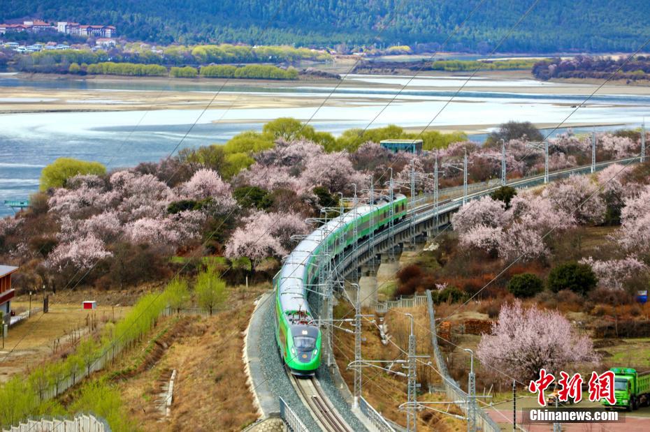 近日,中國(guó)鐵路青藏集團(tuán)有限公司介紹,3月下旬至4月,拉林鐵路沿線綿延的野生桃花林盛開(kāi),藍(lán)天、白云、桃花、雪山、高原復(fù)興號(hào)動(dòng)車(chē)等相互交織,形成了一幅幅美不勝收的畫(huà)面。圖為穿梭在桃花林中的拉林鐵路高原復(fù)興號(hào)。