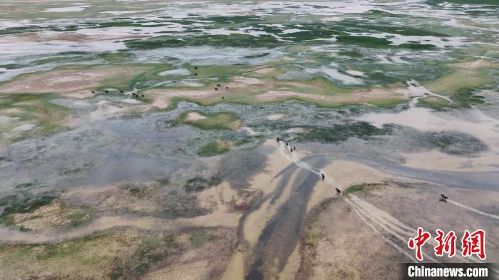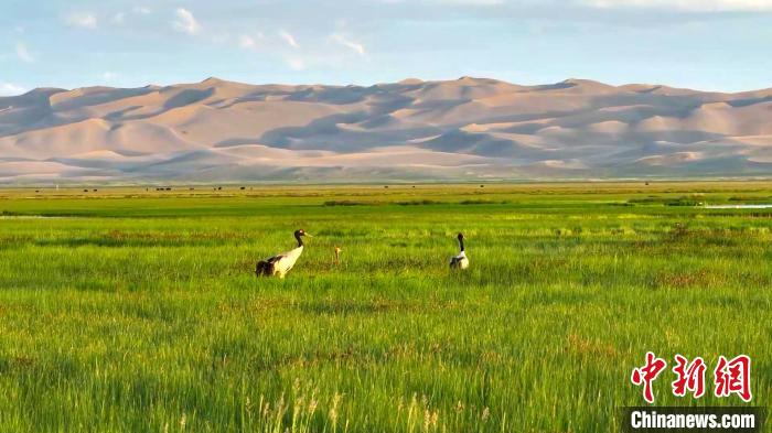 空中俯瞰阿爾金山國(guó)家級(jí)自然保護(hù)區(qū),芳草萋萋的依協(xié)克帕提濕地上,優(yōu)雅靈動(dòng)的黑頸鶴夫婦正在教授新出生的黑頸鶴寶寶學(xué)習(xí)捕食的技巧;鶴群的不遠(yuǎn)處,藏原羚一邊享受著多汁的青草,一邊好奇地打量著周圍的環(huán)境。