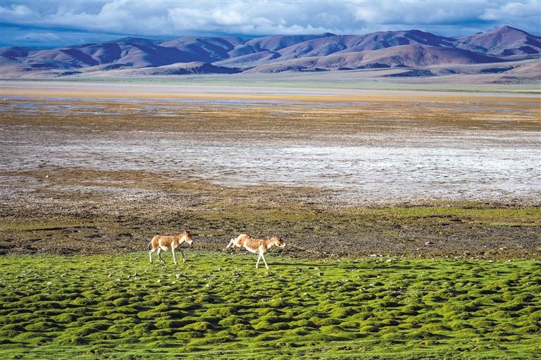 在山南市哲古草原上嬉戲的藏野驢。新華社記者 孫非 攝