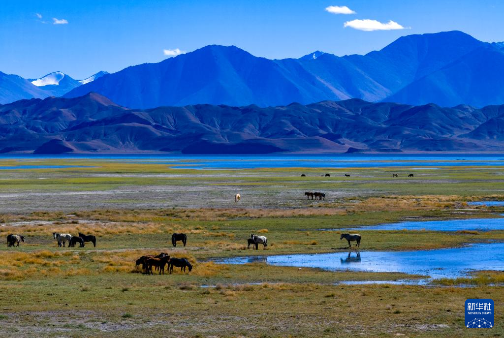 牧民在班公湖畔放牧(無人機(jī)照片,9月21日攝)。新華社記者 姜帆 攝