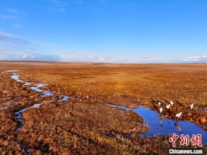 金秋十月,位于青海湖北岸的草原一片金黃。攝影愛好者在青海省海北藏族自治州剛察縣吉爾孟鄉(xiāng)日格加柔地區(qū),拍攝到六只黑頸鶴在這里“安家落戶”,它們或擠在一起沐浴秋日的暖陽,或三五成群覓食嬉戲、閑庭信步,為草原增添了一份靈動與生機。黑頸鶴被稱為“高原仙子”“鳥類大熊貓”,是全球十五種鶴類中唯一在高原繁殖和棲息的鶴類。