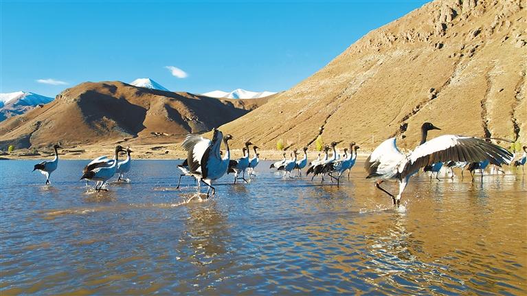 10月23日,成群的黑頸鶴在拉薩市當(dāng)雄縣阿熱濕地內(nèi)覓食。黑頸鶴是全球十五種鶴類中,唯一在高原地區(qū)繁殖和越冬的鶴類,屬中國(guó)國(guó)家一級(jí)保護(hù)野生動(dòng)物。 [詳細(xì)] -