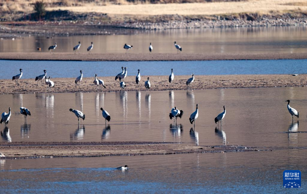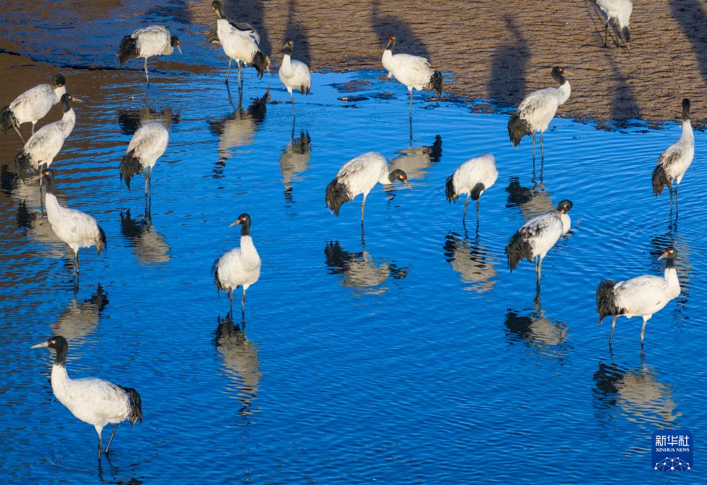 這是在拉薩市林周縣虎頭山水庫(kù)拍攝的越冬黑頸鶴(10月24日攝)。新華社記者 姜帆 攝