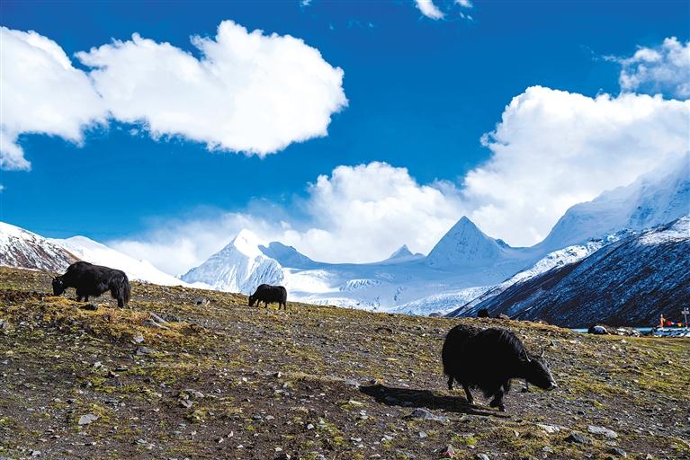 圖為牦牛在薩普雪山腳下的草場(chǎng)上吃草(10月28日攝)。新華社記者 孫非 攝
