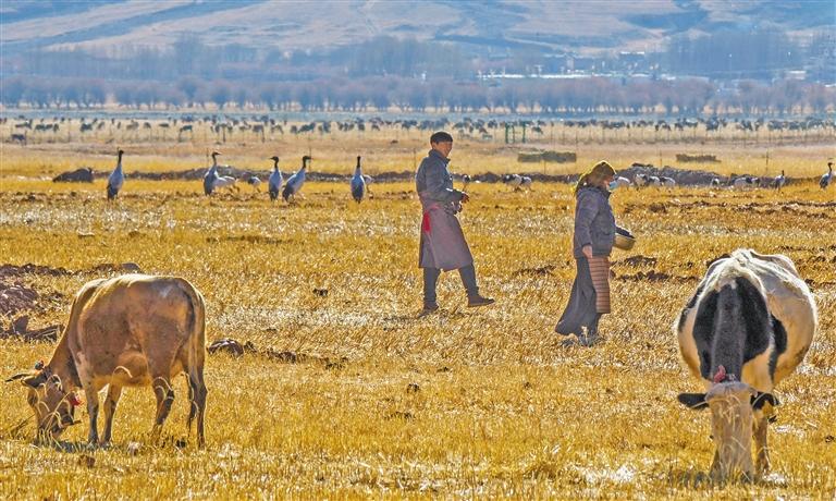 卡孜濕地是其中一個投食點(diǎn)?,F(xiàn)年43歲的洛桑次旦就住在附近,每天一大早,他都會到卡孜濕地放牧。“‘鄰居’越來越多了,十幾年的時間,黑頸鶴的數(shù)量從幾只增長到幾百只?!甭迳4蔚└嬖V記者,黑頸鶴和牛各吃各的,互不干擾,非常和諧。