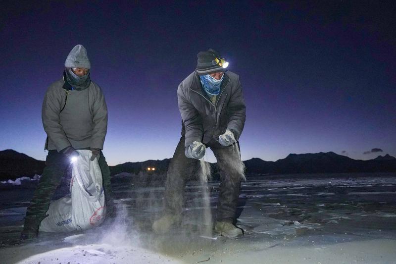 2月1日凌晨5點,記者從浪卡子縣趕往推瓦村。村口停放的小貨車里,整齊地堆放著裝有爐灰的麻袋。村民旺堆告訴記者,冬季里,推瓦村草場不能為羊群提供充足的牧草,而普莫雍措湖心島有著豐茂的水草。因此,在普莫雍措結冰期,村民們會將羊群趕到湖心島,湖面解凍前再把羊群趕回村里。