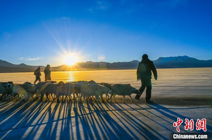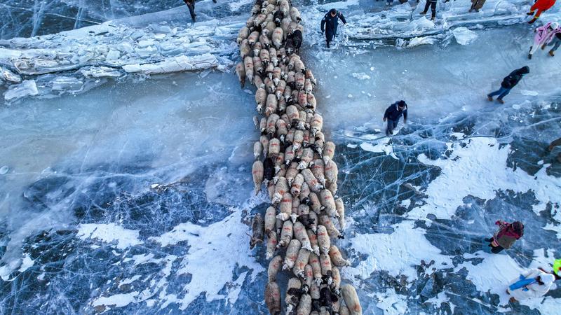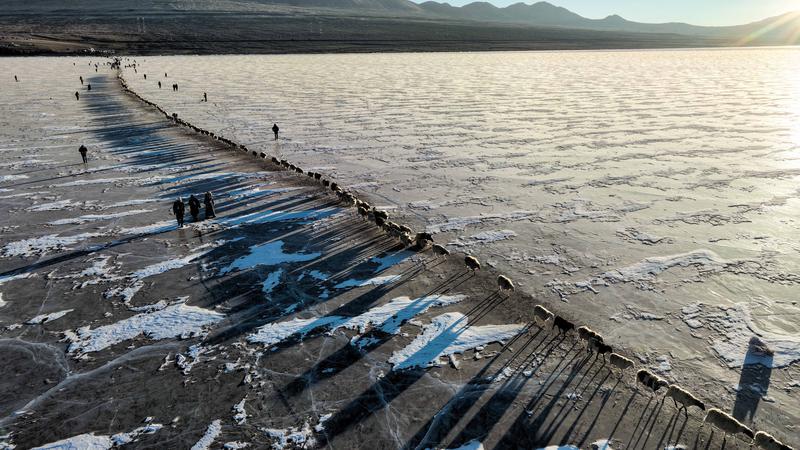 去往湖心島的路程大約3公里,走在冰面上,偶爾響起的冰層破裂聲還是讓人不由得心驚。此刻,幾百只羊宛如一條長長的直線,在牧羊人的指揮下緩慢前行。金色的太陽露出地平線,羊群的影子投射在藍色的冰面上,美不勝收。
