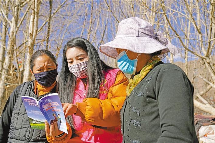 圖為近日,西藏山南市瓊結(jié)縣“四講四愛”群眾教育實踐活動辦工作人員為村民宣講疫情防控知識及“講文明愛生活”內(nèi)容。 記者 耿銳仙 攝