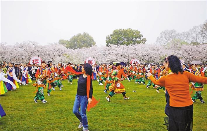 圖為在武漢西藏中學(xué)舉行的東湖櫻園綠色行活動(dòng)中,各族師生翩翩起舞。西藏日?qǐng)?bào)記者 索朗瓊珠 次仁片多 攝