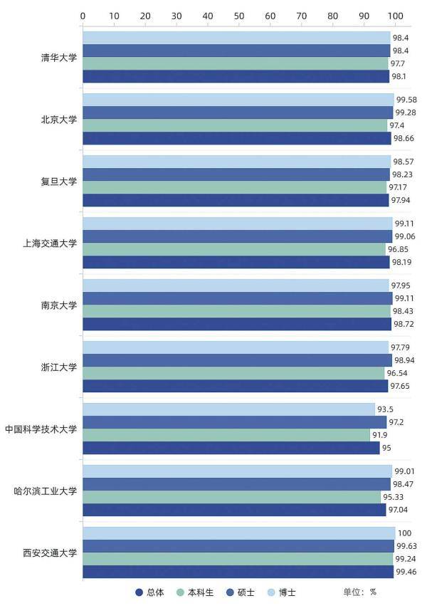不過,南京大學(xué)成為個(gè)例,博士生就業(yè)率為97.95%,低于本科生和碩士生就業(yè)率。另外,除中國科大、浙大博士生就業(yè)率略低于碩士生就業(yè)率外,其他高校博士生就業(yè)率均為最高。