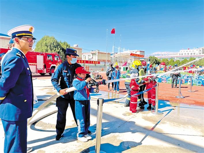 圖為山南市消防救援支隊工作人員引導(dǎo)小朋友們體驗消防器材的使用。郎永庫 攝
