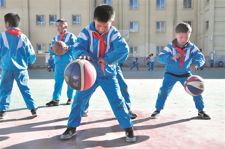三年級4班學生嘉央群培報了籃球項目。他說:“我喜歡打籃球,每天寫完作業(yè),都會在院子里打籃球,我想通過打籃球長身體?!?/p>