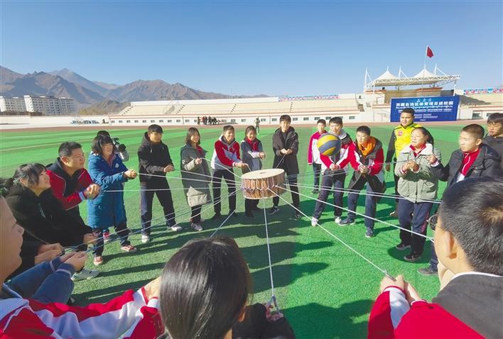 圖為西藏自治區(qū)“體育項(xiàng)目進(jìn)校園”拉薩北京中學(xué)站活動(dòng)中,學(xué)生在參加“齊心筆”拓展訓(xùn)練。 記者 潘璐 攝