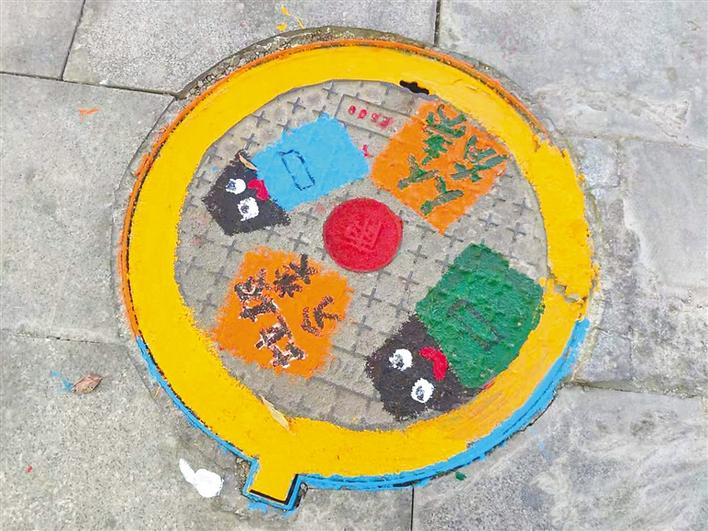 以環(huán)保、垃圾分類為主題的各種彩繪圖案覆蓋上了井蓋,使得原本黑乎乎的井蓋一下變得活潑生動(dòng)起來。