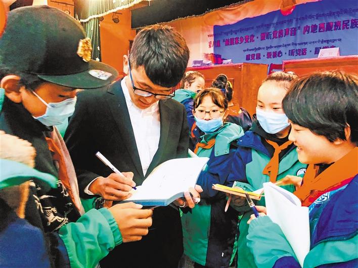 宣講活動(dòng)過程中,共青團(tuán)西藏自治區(qū)委員會(huì)副書記格桑卓瑪、西藏青年報(bào)社副社長(zhǎng)洛桑頓珠給6所學(xué)校內(nèi)地西藏班的學(xué)生們贈(zèng)送了《西藏青年報(bào)》《西藏青年》等刊物和書籍。格桑卓瑪語(yǔ)重心長(zhǎng)地囑咐孩子們:“作為新時(shí)代的新青年,要時(shí)刻牢記時(shí)代賦予的新使命,要用新時(shí)代的標(biāo)尺審視自己,用科學(xué)文化武裝自己,淡化宗教消極影響,在新征程的熔爐中鍛造自己,努力使自己成為堪當(dāng)民族復(fù)興大任的新青年,在全面建設(shè)社會(huì)主義現(xiàn)代化國(guó)家新征程中貢獻(xiàn)自己的青春力量,做神圣國(guó)土的守護(hù)者、幸福家園的建設(shè)者,在青春的閃光中踐行‘感黨恩、愛核心、聽黨話、跟黨走’的家國(guó)情懷。”