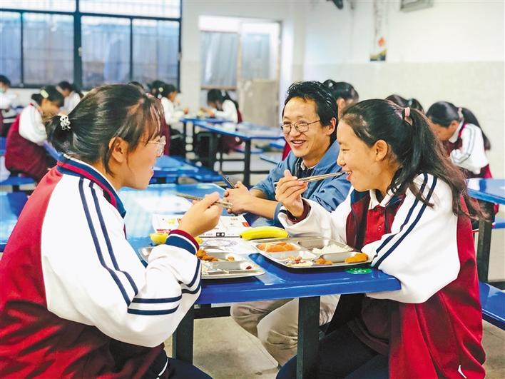 西藏青年報(bào)社副社長(zhǎng)洛桑頓珠(右二)在珠海四中學(xué)校食堂與內(nèi)地西藏班學(xué)生進(jìn)行交談。