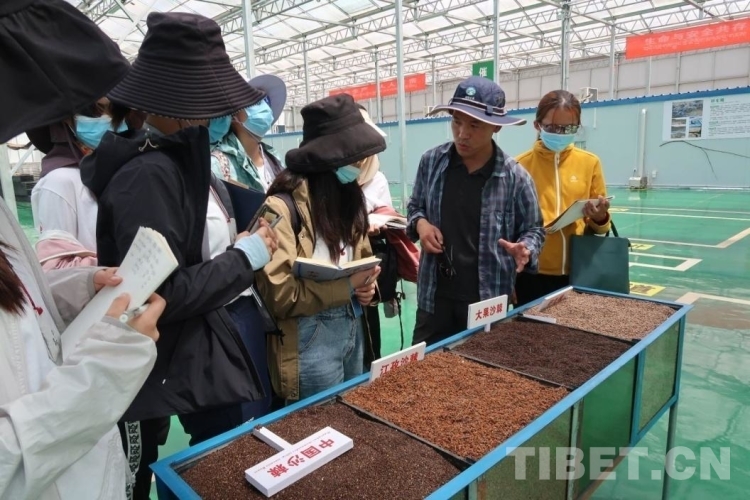 圖為綠亞生態(tài)的工作人員給同學(xué)們講解沙棘種子的選育