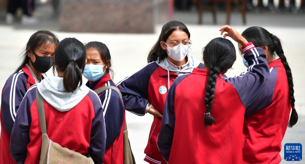 碌曲縣藏族中學的幾名高二學生在校園里交流(8月30日攝)。新華社記者 陳斌 攝