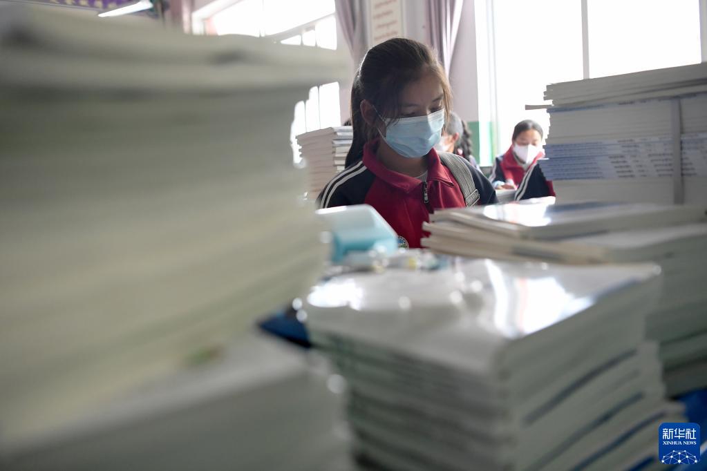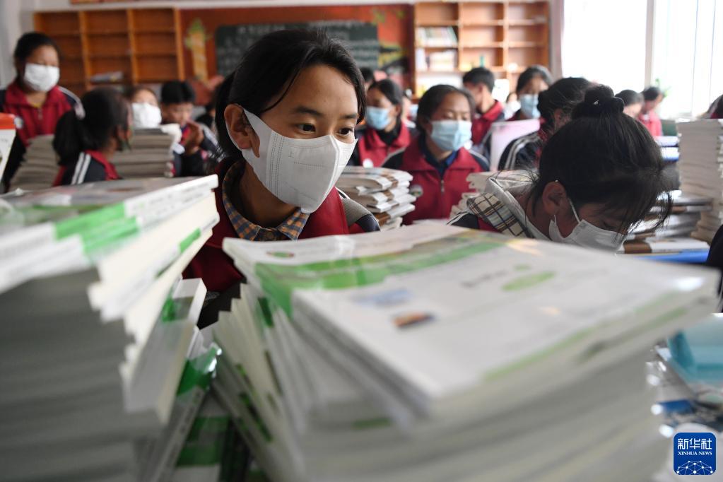 碌曲縣藏族中學的高二學生在教室里整理新學期課本(8月30日攝)。新華社記者 陳斌 攝