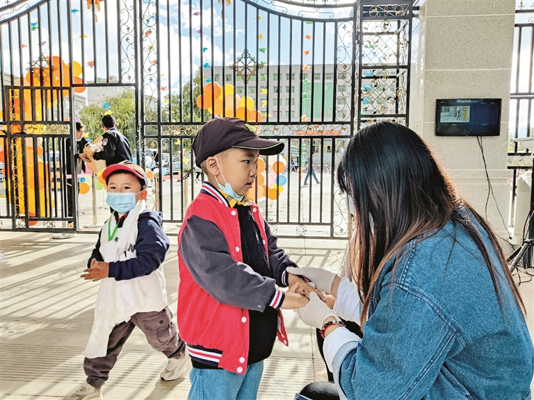 圖為在拉薩江蘇實(shí)驗(yàn)幼兒園門口,老師對(duì)入園幼兒進(jìn)行手部檢查。拉薩融媒記者 余洋洋攝