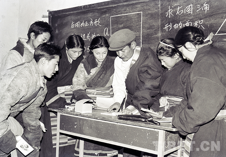 這是班戈縣小學校長申卻堅村在給學生上課(唐召明1987年攝)