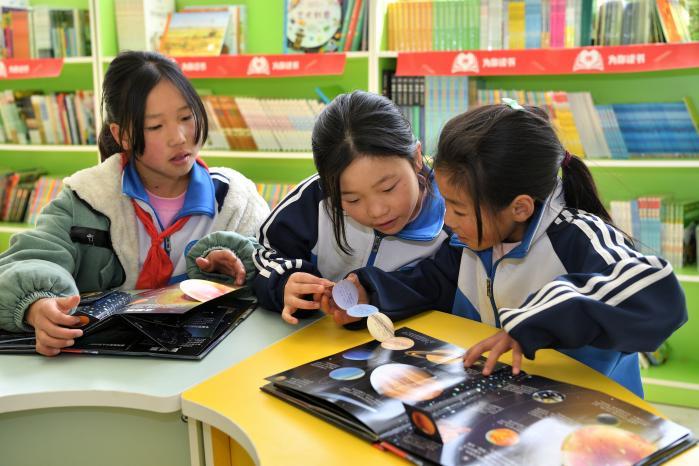 藥山鎮(zhèn)中心小學(xué)的同學(xué)們?cè)谛麻喿x室閱讀新書(shū)。