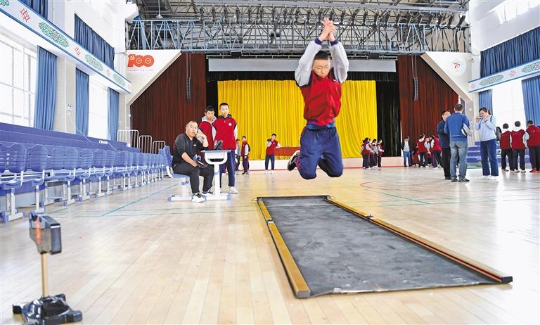 圖為北京第二外國(guó)語(yǔ)學(xué)院拉薩附屬中學(xué)的學(xué)生進(jìn)行立定跳遠(yuǎn)測(cè)試。記者 潘多 攝