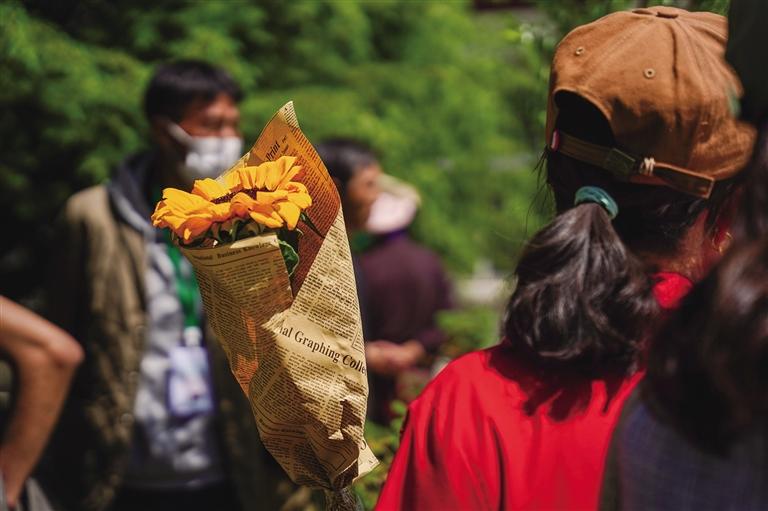 送考家長手持向日葵 希望孩子“一舉奪葵”