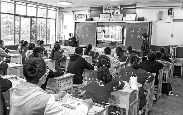工布江達縣公安局禁毒大隊民警與拉薩市職業(yè)技術(shù)學院志愿者在縣中學向?qū)W生播放禁毒宣傳片。記者 彭琦 實習生 旦增旺姆 攝