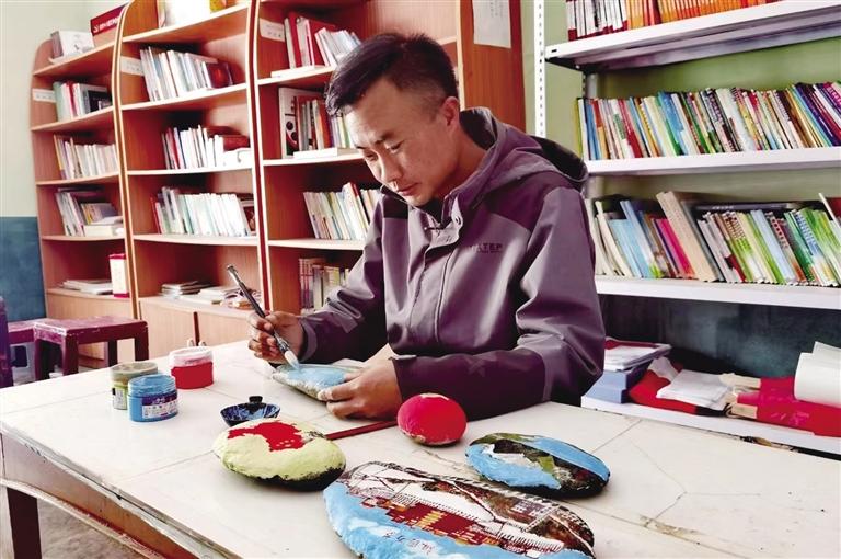張銀波駐村期間,通過手繪石頭畫慶祝中國共產(chǎn)黨成立100周年。文/圖 記者 次吉