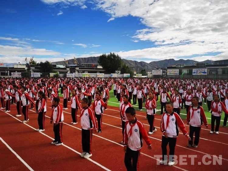 資料圖:日喀則市上海實驗學校學生們正在跳具有民族特色的課間操